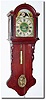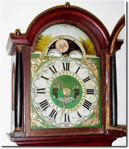 This clock has alarm mechanism intact (alarm chain is missing, replacement available, weight is here), and alarms on an iron bell on top of movement. Has a rolling moon and 31 day concentric calendar (calendar hand missing). Now striking on a gong (should be bell). Top finials missing (brass balls showing). The chapter ring of the dial looks original, but center and perimeter are repainted in forest green. 4 seasons corners. Basically a good old clock that can be brought back nicely. Height 51'