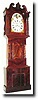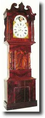 8-day, time and strike with rolling moon. This mahogany clock is in generally good condition, but has some points that should be discussed. The base or plinth has had about 6" cut off leaving it a bit squat looking; a modern molding has been added that really isn't tall enough for the job. The movement is sound and complete except for a missing calendar gear. The dial is attractively painted with floral corners; fretted brass hands are original. Nice broken arch hood with carved grapes between the horns. Height 87" $1750-2250