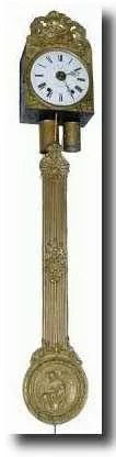 with religious themes. The dial surround shows a nun reading the scriptures with a child, and the pendulum center with a winged angel holding an infant. The movement is a crown-verge with alarm intact. The dial is signed Chauoin a` Chateauneuf and has some hairlines, but is very good. The hour hand is in 2 pieces (taped for photo). The cord has failed and needs renewing. Generally a good sound clock that will respond to cleaning and run for many years to come. Note weights are soup cans filled with lead, painted gold; brass of clock has been sprayed gold as well. Height 58" $400-600