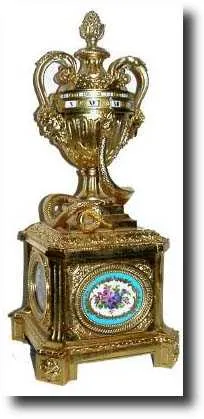 with pendulum movement, silk thread suspension, in restored condition. The case has been gold plated and about half the hour numerals have been restored with epoxy, painted over; minute numerals with some cracks. Note the time is indicated by the serpents tongue. Each lower panel has a painted porcelain plaque, the front one a floral spray and the other 3 of cherubs. The original silk style pendulum has been misplaced, and we will provide a new wire and bob kit that will need fitting. Rotary dial clocks with pendulum movements are quite rare. Height 16" $9000-12000