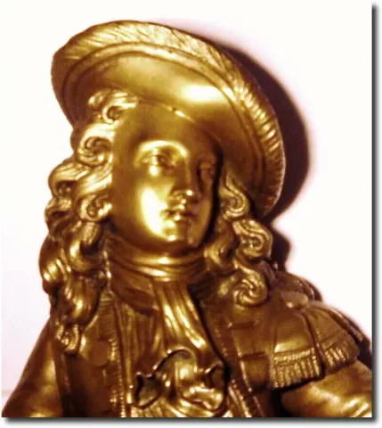 C.1840, French, Bronze Figural clock in good condition. This clock depicts a youthful male in court dress (you"d need 10 cuff-links for these giant cuffs), and with a block hammer in his right hand. The base showing two geese at a fountain and with grapes, pineapple and squash below that; superb detail on casting. With a good silk thread movement, striking on a bell (pendulum replaced and still needs a better one, call Timesavers). Small dial chip by winding hole. Height 17'