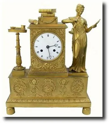 C.1840, French, Empire Period, Ormolu figural clock with silk thread movement. This has the wonderful theme of "culture", the center pedestal with a stack of books and a rolled scroll; the pedestal at left with an incense burner, another scroll and a two sided cup. And the featured lady playing a horn, held in her right hand, and holding her music score with her left hand. This clock took a tumble at some time and the dial is with hairlines and a chip by 5, and the hands, though old, are too long for this dial, and have had their tips cut. No pendulum. Lots of potential. Height 14" Reserve $2200