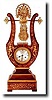 C.1840, French, Inlaid Lyre Clock, the case of rosewood with satinwood inlays of armor, flowers, ribbons and scrolls. This clock has a well made movement signed Fabrique Rollin, Paris, and is clean and running. The silvered brass dial has a delicate engine turned pattern, as was the style at the time; original moon hands. (Note we will take out the movement for shipment on this one, as the bell and crutch stick out precariously from the rear). The cast floral pendulum is of gridiron style, suspended from the large ormolu spray at the apex. Height 23" $2500-3000