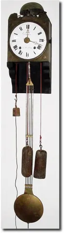 C.1840, French, Morbier 2-weight, as-found. Heavy Morez construction with repeat of strike at 2 minutes after the hour; large meter pendulum with narrow 5-rod gridiron. This is an alarm model, but you will need to drill the left bracket support for the alarm cord to pass through. The dial has some old repairs to the enamel, but is generally fair, and signed Dunan a" Moulin. Also this is an earlier crown/verge escapement. Recently restrung, but needs oiling and adjusting. Height 55'