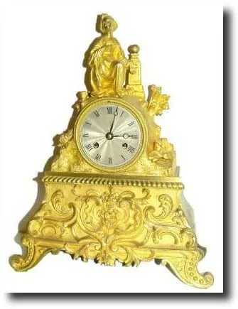 C.1840, French, Ormolu Figural Clock, in generally good condition. Retains original silk thread movement and engine turned dial (silver over brass). There is some wear to the gilding, although it looks quite bright in the photo. Subject matter is a pensive adolescent girl, hand over her heart, kneeling at a monument. The base is a fantasy of scrolls and ribbons, attractively done. Runs and strikes; dial is good. Height 12" Reserve $1000