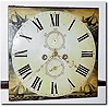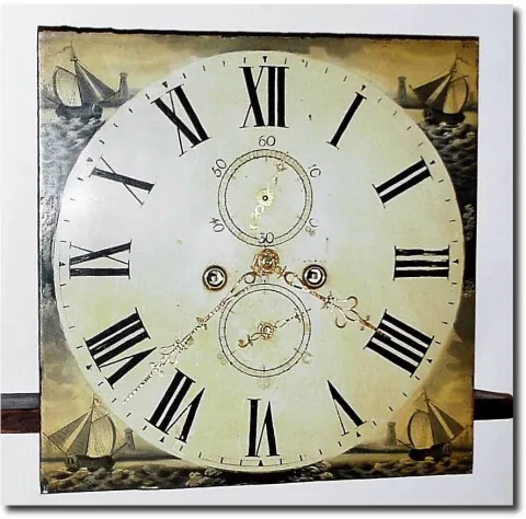 C.1840, Movement and Dial, 8-Day, English, the 14' square dial attractively painted with sail boats in each corner. The second bit and calendar ring have been poorly touched up and will need attention. The movement itself is clean, and looks to need only weights and pendulum to be functional; the brass hands do not show up well in photo; 14'