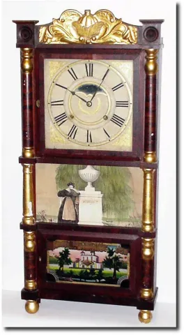 Retains a good label (with tear and holes), excellent original wooden dial and signed strap brass movement. Top and lower glass retain original putty, the lower tablet of a mansion, about 20 percent flaked. Original shell/gilt columns have some abrasion and damage, but are still quite good; gilt splat is very nice. Note the middle glass has a primitive print. A very decent triple decker; height 38'