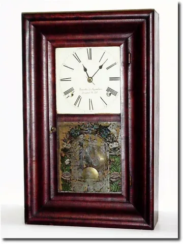 C.1848, Brewster and Ingrahams, Mini 30-hour OOG, time and strike, brass spring. This clock was restored around 1965, when it was bought at a retail shop (info on key tag). The dial has been nicely repainted and the case refinished; minute hand is too short; tablet is about 50 percent flaked; label is very good. Note this is the heavy ribbed movement with low winding arbors that give the appearance of an 8-day; generally good plus cond; Height 17.5'