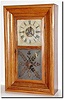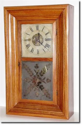 This is the same movement used in the small acorn and other shelf clocks. See Robert"s book on Ives, page 255. This movement is original to this case, as is the label (with some holes and tears). The center hole in the dial is larger than normal, and most of the signature is cut off; the tablet is broken in several pieces and glued (small bits missing) and the case has been stripped and bleached and then lacquered so is quite light. Height 19'