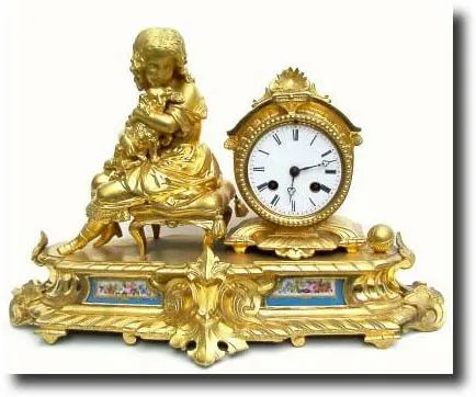 with hand painted panes in base. This is a very sweet theme, a young girl with curly locks sitting on a fancy silk cushion with tassels, and holding her cocker spaniel in her arms, her chin resting on the dogs head. The dogs ball is on the floor to the right of the clock. The original gilding is very bright. The dial has an old repair by the numeral 11 which is not too noticeable. Has a well made silk thread movement, signed Japy Freres, and with award stamp for the year 1844; movement numbered 708. Height 11 inches (28cm) Reserve $2000