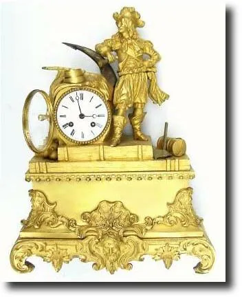 C.1850, French, Ormolu Figural Clock, Spanish explorer motif. Is this Balboa or Cortez? A Spaniard in 16th Century dress, along with marine and conquest items: cannon, cannon balls, sail, axe, trunk and anchor, the whole resting on a base with waves and a bust of Neptune. The once silk suspension is now by spring, and the dial with hairlines around 7. Runs and strikes on a bell. There is loss to the gilding on the sides of the clock, but the front is still very bright, and the conquistador himself is nearly perfect; note crystal is open for photo to reduce glare. We were fortunate to receive such a wide variety of French figural clocks in this sale. Height 17 " Reserve $1300
