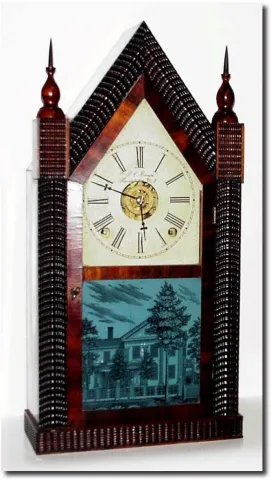 C.1850, J.C. Brown, Ripple Steeple in excellent condition. At first you might think the case was refinished, but careful examination shows it has simply been well cared for, and each side with its original matched rosewood. The dial has been professionally repainted with a crackle finish, and proper J.C. Brown "signature". The original label is so bright you"ll be amazed. And with original alarm mechanism, hands and threaded finials (finials at podium). Old key and pendulum in bottom of case. Blue/black mansion tablet w/ very minor flaking; Height 20'
