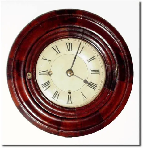 C.1850, Marine Clock Co., rare miniature gallery timepiece in mahogany. Neat turned case with original Terry door latch. The original dial has been professionally restored. See detail image; this clock has the rare double "scape "chaff cutter' movement designed by Chas. Kirk (30 hour). Diameter 10'