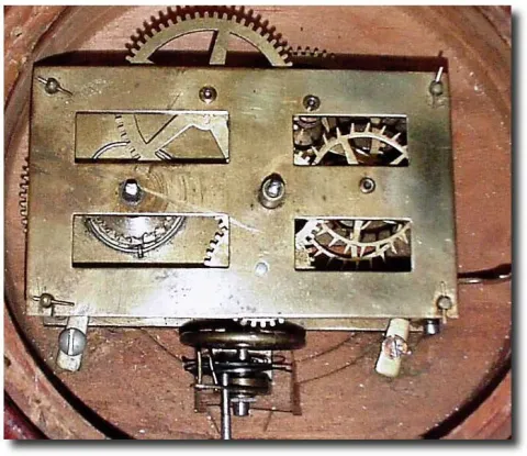 Neat turned case with original Terry door latch. The original dial has been professionally restored. See detail image; this clock has the rare double "scape "chaff cutter' movement designed by Chas. Kirk (30 hour). Diameter 10'