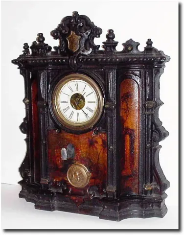 C.1852, Bristol Brass and Clock Co, 3 Cortlandt St, New York, a large and impressive 8-day iron front. This clock is missing the center alarm wheel and a typical 3-point alarm mechanism that you can probably find. Otherwise, this is an exceptional case with original paint and MOP intact with only minor edge abrasion; original dial, hands, pend, bell, etc. Lower crystal is replaced with a large brass button with an embossed eagle (can be left or removed easily). This is a heavy clock; width 17', Height 21'
