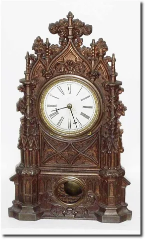 C.1855, Bristol Brass and Clock Co., no. 3 Cortlandt St, NY, an 8-day iron front in excellent original condition, clean and running. The iron casting is complete with no chips nor breaks. Most of the gilding is worn off at this point. Original paper dial in brass bezel and with original hands. excellent label. Height 17'