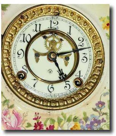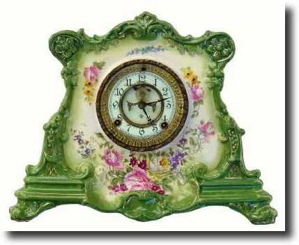 forest green accents. This is a good looking clock. The open escape movement is sound and the porcelain dial near perfect except for a hairline near 2...