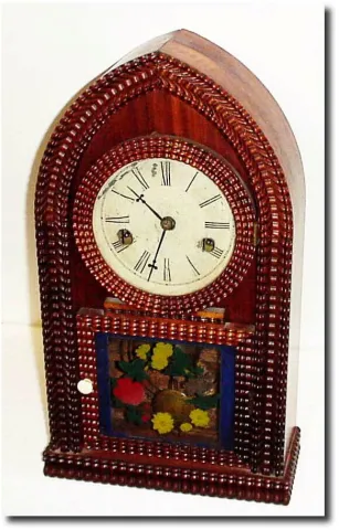 C.1855, J.C. Brown, Mini Ripple Beehive in excellent condition, 30 hour time and strike. The only minor shortcomings are that the case was refinished some time ago, and someone used a key too large in diameter and scoured out the left dial hole a bit. That tablet with the bright yellow flowers is original, as well as the hands, pend, label and dial (no signature apparent). A welcome addition to any Forestville collection. Height 15.25'
