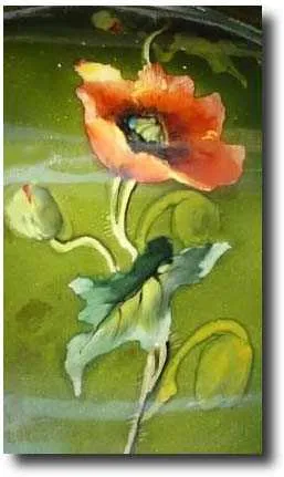 condition. The color is a very deep green, with gold highlights on all the edges. Also has 3 dimensional vines up the sides and with dark orange lilie...