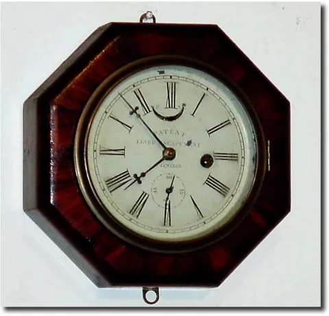 C.1860, A Marine Lever Timepiece in a rosewood octagonal case. The case bears an attractive label of Dan"l Pratt and Sons, Showroom, 49 Union St., Boston. The 30-hour movement is a Pomeroy patent lever, with brass rim balance with steel spokes. The original dial retains excellent stencil: "Patent Lever Escapement, Jeweled'. Hands and second bit also orig. Case lightly varnished over. Height 8.5'