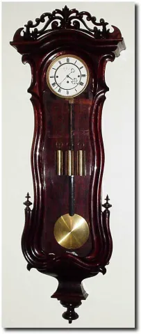C.1860, Austrian, 3-Wt, Grand Sonnerie Wall regulator in very good to excellent original condition. This is a very attractive serpentine clock; note the fretted top was recently repaired and repolished by a good cabinet maker; repairs disguised with black paint. Some scratches inside, on the case where it was transported with the weights in, will need attention. The well made 72 beat movement retains original dial, hands, pulleys, weights, etc. Note the chapter ring has two spider cracks (but no chips) signature unreadable. Pendulum is good with no dents and painted beat scale is original (some paint loss); good old crank as well; key lock case. Note superb pulleys with petal shaped spokes. Despite flaws, a very good clock; height 53'