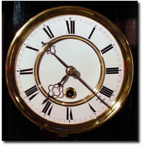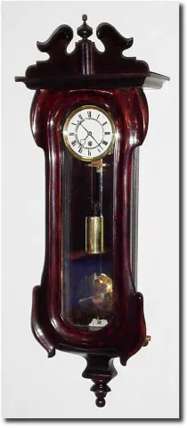This clock has everything a Vienna collector is looking for: perfect white porcelain dial, original hands, finish, top, miniature star pulley, painted beat scale. With the small 3' dial, and a well made 8-day movement. Original wooden handle winding crank. The case has a dark maroon (almost black) finish; top is held on by 2 pegs (one replaced) Height 29'