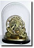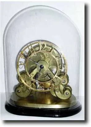 in a scroll frame. This clock is unsigned, but is nearly identical to one pictured in the book Skeleton Clocks, by F. B. Royer-Collard (1969), page 14 (clock by Pace, fig1-19). In this configuration, power is supplied with two spring barrels and two fusees, and the additional wheel is added between the fusees. The center arbor is planted at the apex of the front frame and the fourth and escape wheel is held by a delicate cock from the left, and the pallets by a separate cock from the right. The movement is mounted to an oval of cast brass, well finished, with a center hole for attaching to an additional base. Pendulum rod original; bob replaced; dial has been straightened and with cracks. With a replacement old dome that covers the clock, but could use a bottom base that fits better. Height of clock 8.5", with dome 13" $2000-2500
