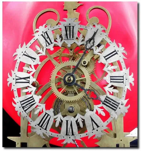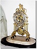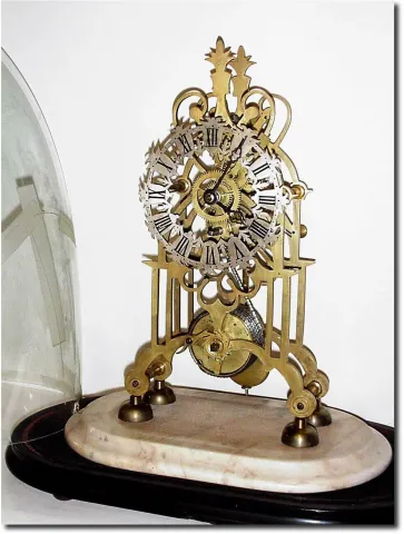 Although the dome is severely cracked, and is just a dust cover at this point, the clock itself is a well made item by Haycock of Ashbourne in Derbyshire. Refer to Royer-Collards Skeleton Clocks, page 58 for frame designs from Haycock"s pattern book, and following pages for details on this quality maker. This clock is mechanically sound and a good example of this maker"s work. Clock ht, 13', w/ dome 15'