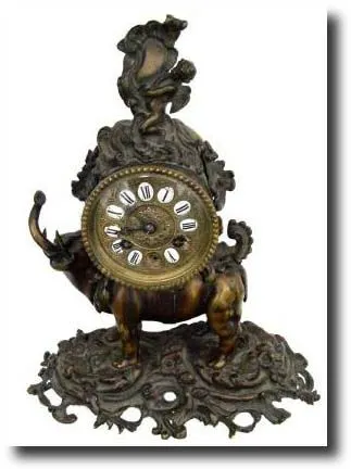C.1860, French, Japy, bronze "Elephant" clock. This clock comes to us as-found and IS missing the numerals 4 and 6. The bronze case is an intricate casting with lots of rococo detail. This is a small eared Indian elephant, as used in Louis XVI clocks of the same style. The case is surmounted by a winged cherub. This clock came to us from storage and the case is very dusty; the movement was cleaned maybe 20 years ago and is still trying to run and strike. Refer to Tardy's La Pendule Francaise, part II, pages 232-233 for similar clocks with this motif. Some real potential if you can make replacements for the numerals. Height 12" (32cm) Reserve $1100