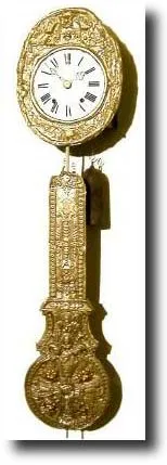 in good condition, clean and running. The dial surround and pendulum have been sprayed gold in lieu of cleaning, and might be better stripped and polished. The porcelain dial is original and perfect, as are the hands; the dial prominently signed Tisserand, a`Vonnas. This heavy movement uses an "anchor" escapement, and strikes the hour on a heavy coiled gong and then repeats the hour at 2 minutes after. Right side door is loose. This robust movement, if maintained will last indefinitely. Note dial surround is loose and needs 4 proper machine screws to hold it in place. Dial 9", height 58" Reserve $450