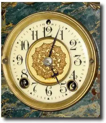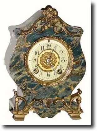 mantel clock. This is a super little clock with original faux marble finish on the clock (green with white veins). There are some chips in the finish ...