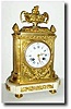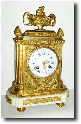 in the style of Louis XVI. This is a well made little clock with fine detail. The ormolu mounts are finely chased and with original bright yellow gilding. The porcelain dial is perfect, with royal blue numerals and well detailed gilded hands. The top urn is slightly loose and the nut has stripped a bit and so will not stay tight (any good mechanic can solve this in a minimum of time). A well made clock with a good look; Height 12" $750-1000