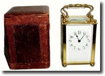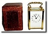 with original travel case (less leather strap). This clock represents the last gasp of cost cutting to keep carriage clocks affordable. 4 square pilla...