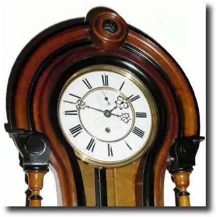 a very unusual figure 8 case in walnut with black accents and delicately turned, full, freestanding columns, and rosette within the turned top piece. ...