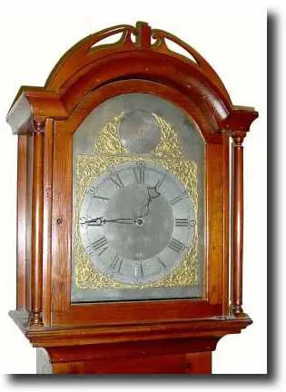 movement with tinplate dial and calendar. Note the gentle arch in the hood door matches the arch on the dial plate, however, shims have been added to ...