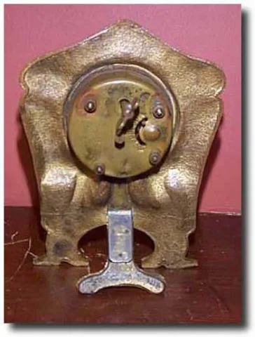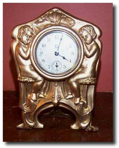 This is a vintage New Haven shelf clock probably from the early 1900s. The case is brass with gilding. It has cherub figures on each side of the clock...