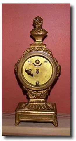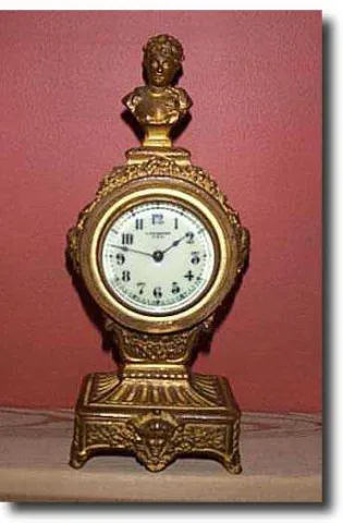 Victorian Empire-design New Haven gold gilded clock. It measures 7 inches high, 3 inches wide at the base and 2 inches in depth. There is a jeweler's ...