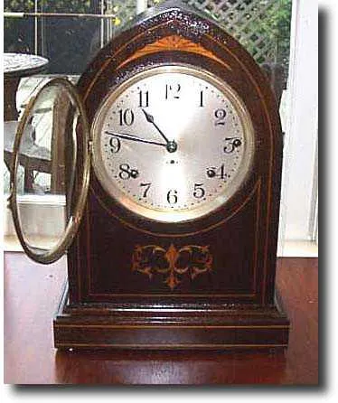Seth Thomas Westminster chime mantel clock with presence. It has a mahogany case with satinwood inlays and is in very good condition with only minor s...