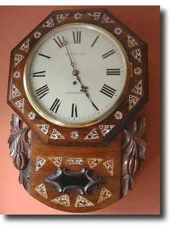 A drop dial clock c1850 by Horsley of Hartlepool, a maker who is not recorded. The case is rosewood inlaid with mother-of-pearl....