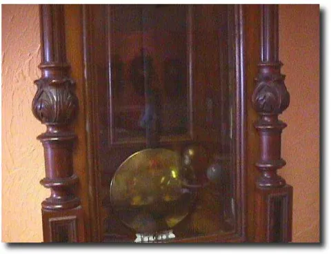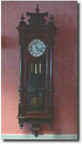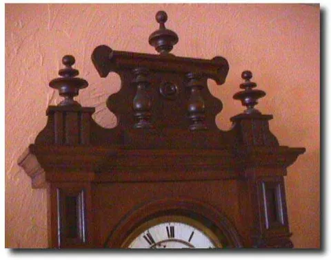 This is a well made carved walnut case with ebony accents. The top headpiece is a nice replacement which fits well with the design of the clock. Also ...