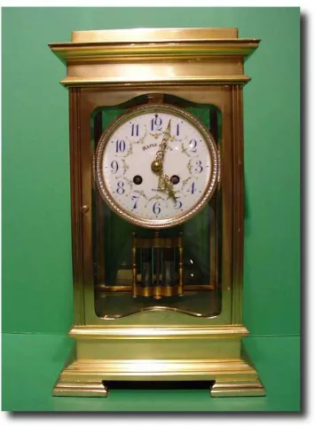 A solidly cast gilt bronze four glass clock by "Maple and Co Ltd", Paris. Beautiful convex white enamel dial with hand painted swags of roses boarding...