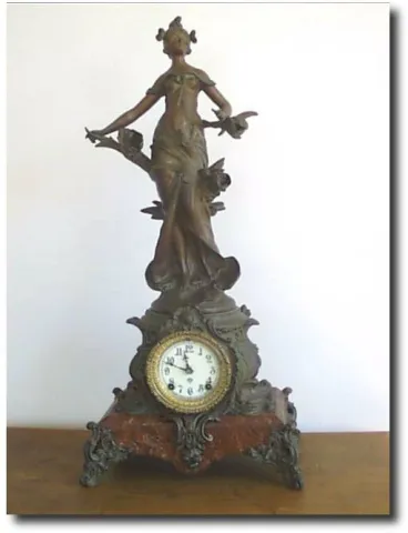 Case: Art Nouveau figure on a patinated metal base. Height ". Works: Ansonia 8 day time and strike on gone. Reference: Ansonia Clocks by Tran Duy Ly C...