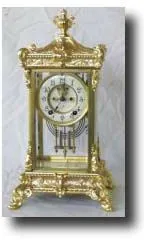 Comment: Brass with gold plated cast top and bottom.. Case: Brass, gold plated brass and bevelled glass. - 16.5" high Works: Ansonia 8 day brass with ...
