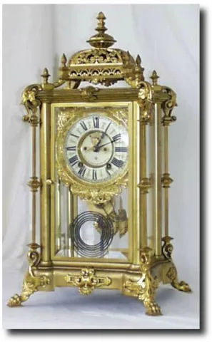 Case: Great detail. Original "RICH GOLD" finish and bevelled "Plate Glass". - 20.5" high Works: Ansonia 8 day brass with hour count and half hour stri...