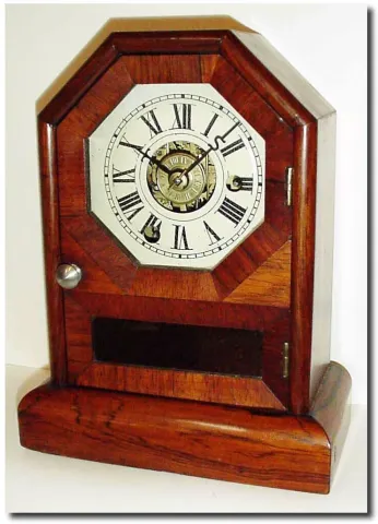 C.1868, Seth Thomas mantel clock, "Octagon Top' time and alarm cottage in very clean restored condition. The dial has been restored at the Dial House and the rosewood case is nicely refinished. Minor blemish in back of case from removal for service. Excellent Thomaston label is protected under plastic. Height 9º' This is the nicest of 3 in sale: