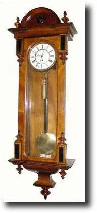 C.1870, Austrian, 1-Weight Vienna Regulator Wall Clock in transitional style with 4 inward facing finials. This clock is another that came to us from storage in Lucerne, Switzerland. The top and finials are recent (well done by a Swiss cabinet maker); movement is dirty and suspension spring needs re-newing (about one buck for a spring). The well made Viennese movement is dirty but sound and will clean up nicely. Perfect porcelain dial. Lots of "look" for the money. Height 46" $400-600