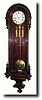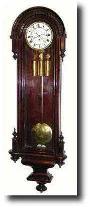 in a transitional style with round top with little bullet shaped half finials all around the curved molding. The quality seat board movement is signed on the dial: F. Rauscher, N. Erdburgstrasse Nr. 5 (mostly rubbed off). The 72 beat movement has been recently cleaned in Vienna, and restrung with slender gut; the dial is perfect with no cracks; smooth weights and pendulum (pend with small crease). Of the 4 inward facing finials on the door, one tip is missing; the case has a deep purple finish, almost black; key-lock door; key absent, and with original bone handle winding crank. Original large stabilizers intact. Still quite nice. Height 49" $2000-2500