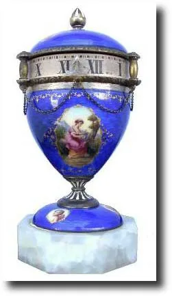 blue enamel over silver, with hand painted female displays.The silver has a gentle damascene pattern that reflects through the translucent blue enamel. The case hardware is silver (excluding movement and dial), with some oxidation. The top has 3 standing ladies in gowns in small cameos, and the base 3 child's faces in cameos. The urn is attached to a small octagon of white marble as a base. These clocks were popular gifts in Central Europe during the late 19thCentury, and are really a work of art; in viewing the top, realize that each cameo is only about inch high, and is hand painted with amazing detail This is a superior example; time only. Refer to Nov '99 sale, lot 317, same size clock in white sold for $3400+. Height 4.7" Reserve $2900