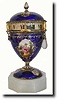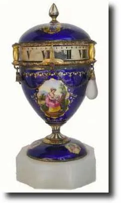 blue enamel over silver, with hand painted female displays. The silver has a gentle damascene pattern that reflects through the translucent blue enamel. The case hardware is silver (excluding movement and dial), with some oxidation.. The top has 3 standing ladies in gowns in small cameos, and the base 3 child's faces in cameos. The urn is attached to a small octagon of white marble as a base. In viewing the top, realize that each cameo is only about" inch high, and is hand painted with amazing detail This is an excellent example; time only. The only minor detraction is two missing jewel drops (glass) that can be left as-is or replaced with similar drops from a jewelry supply house (see detail image). Refer to May 2000, lot 213, cousin to this clock sold for $4550+ Height 4.7" $3000-4000