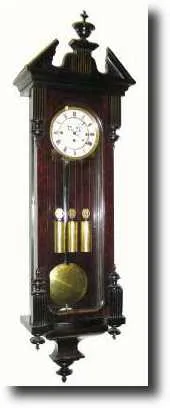 C.1870, Austrian, Wilhelm Stelzer, Wien, grand sonnerie wall clock regulator in a transitional style, and in excellent original condition. This clock has understated elegance, very dark mahogany finish, almost black, and simple pediment top with finial. The Viennese movement is of the highest quality, and with original pendulum, hands, beat scale, winding crank, etc. Minor nicks and scrapes to case commensurate with its age. Height 52" $1750-2250